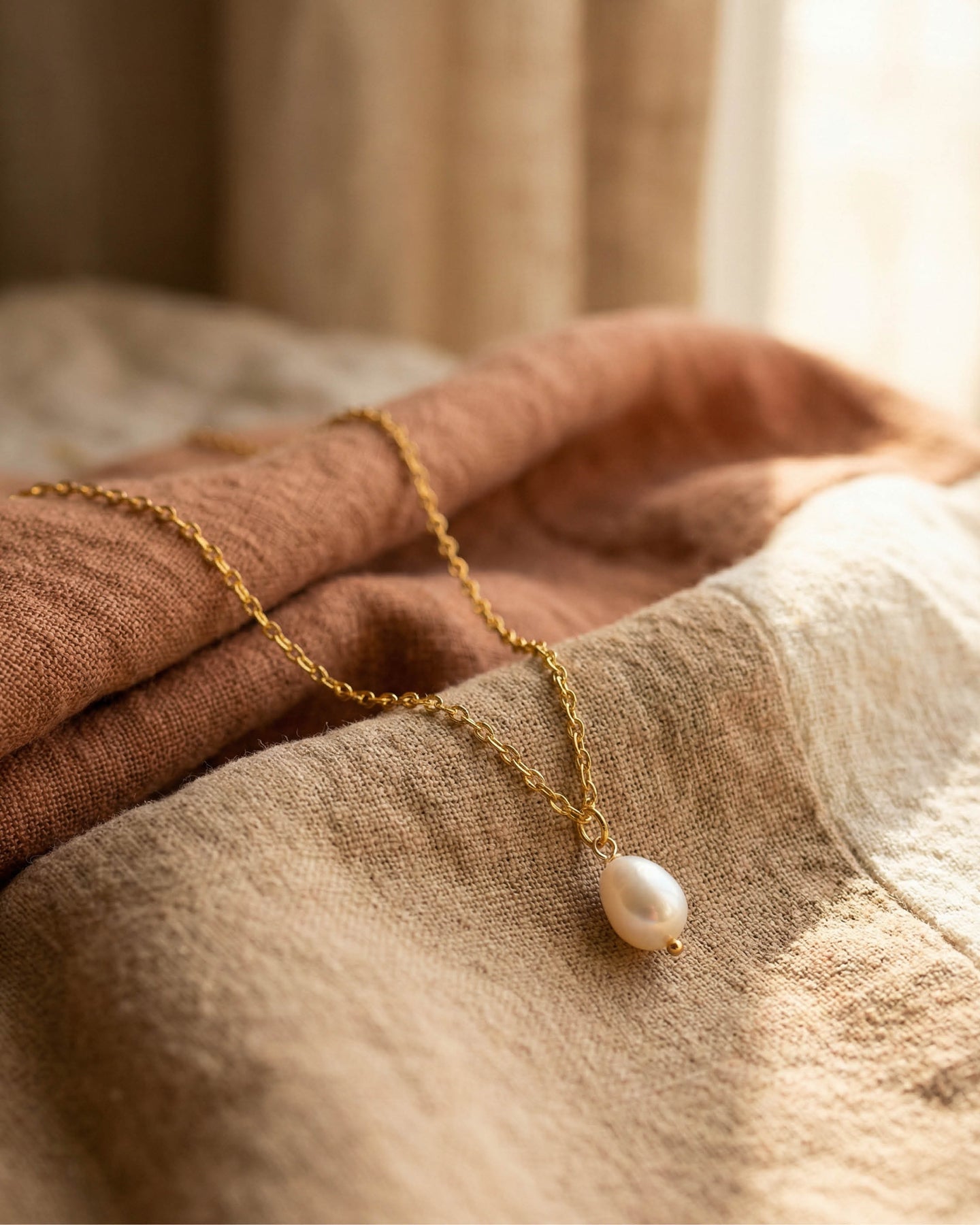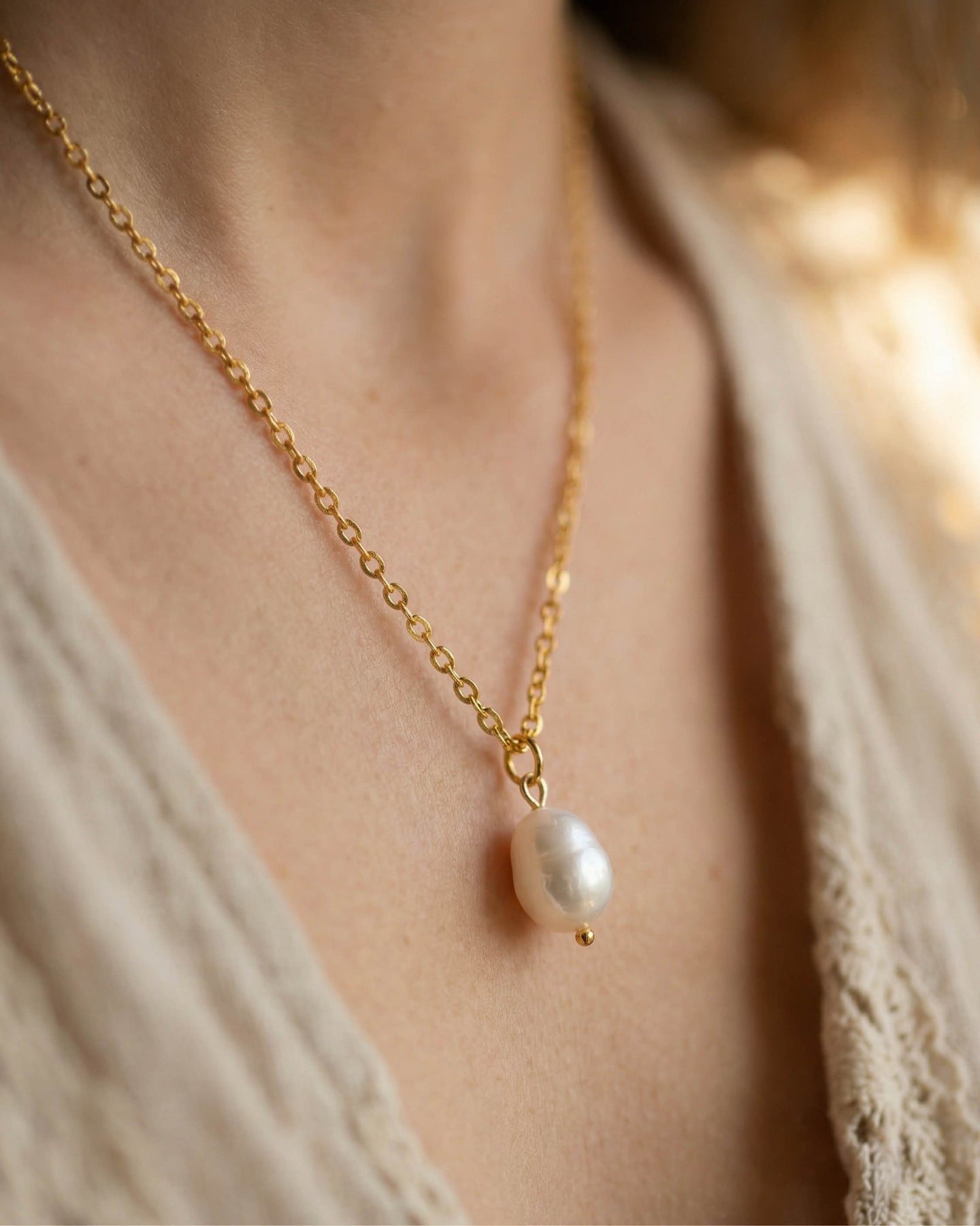 18K altın kaplama zinciri ve doğal inci detayı, saflığı, yeni başlangıçları ve sevgi bağını simgeler. Her inci doğanın bir armağanıdır; bu nedenle inci formlarında küçük farklılıklar görülebilir. Bu da her Perlone kolyeyi tıpkı annelik ve aşk gibi benzersiz kılar.