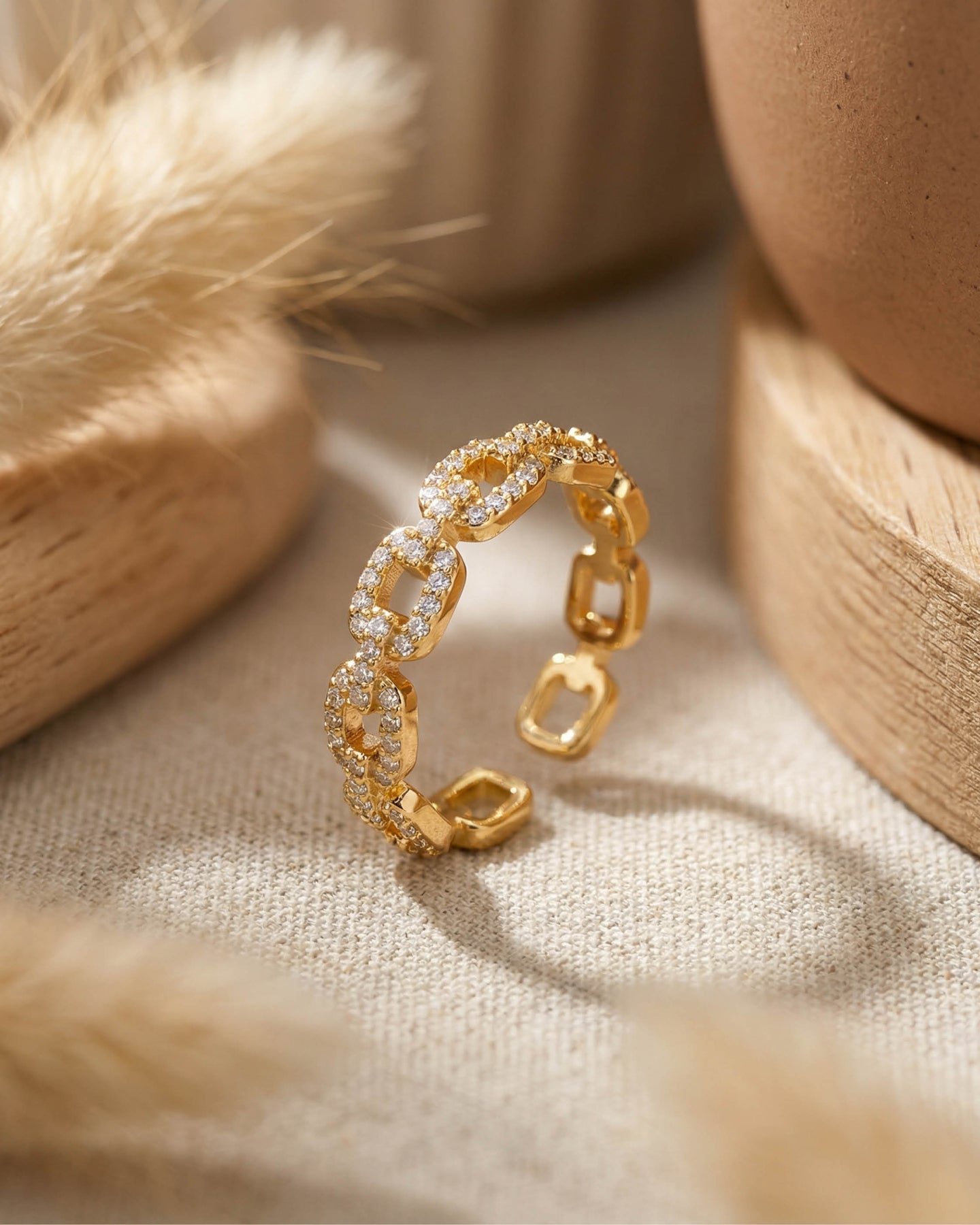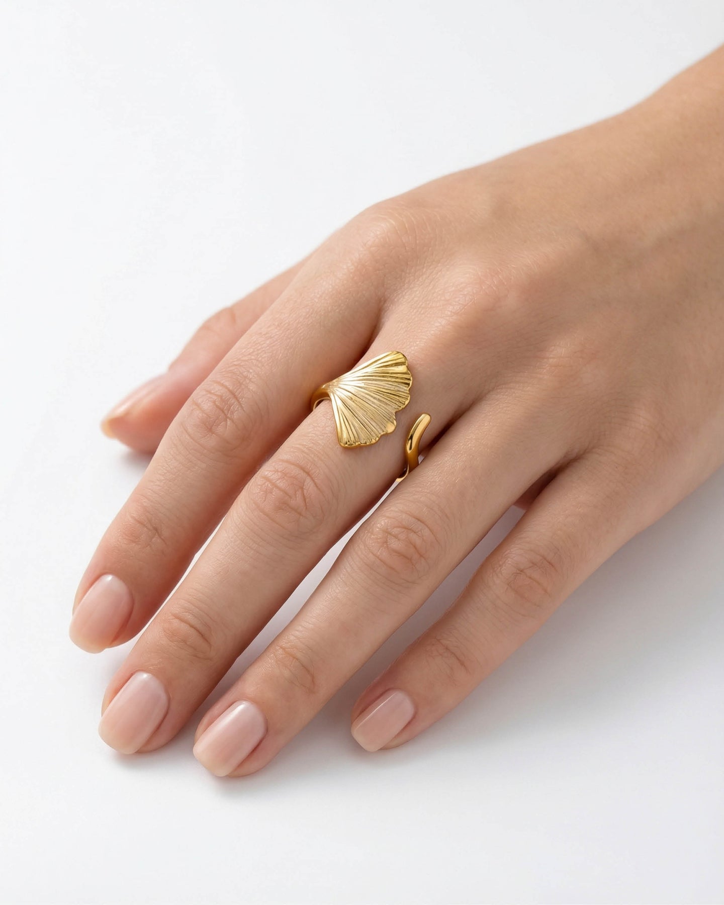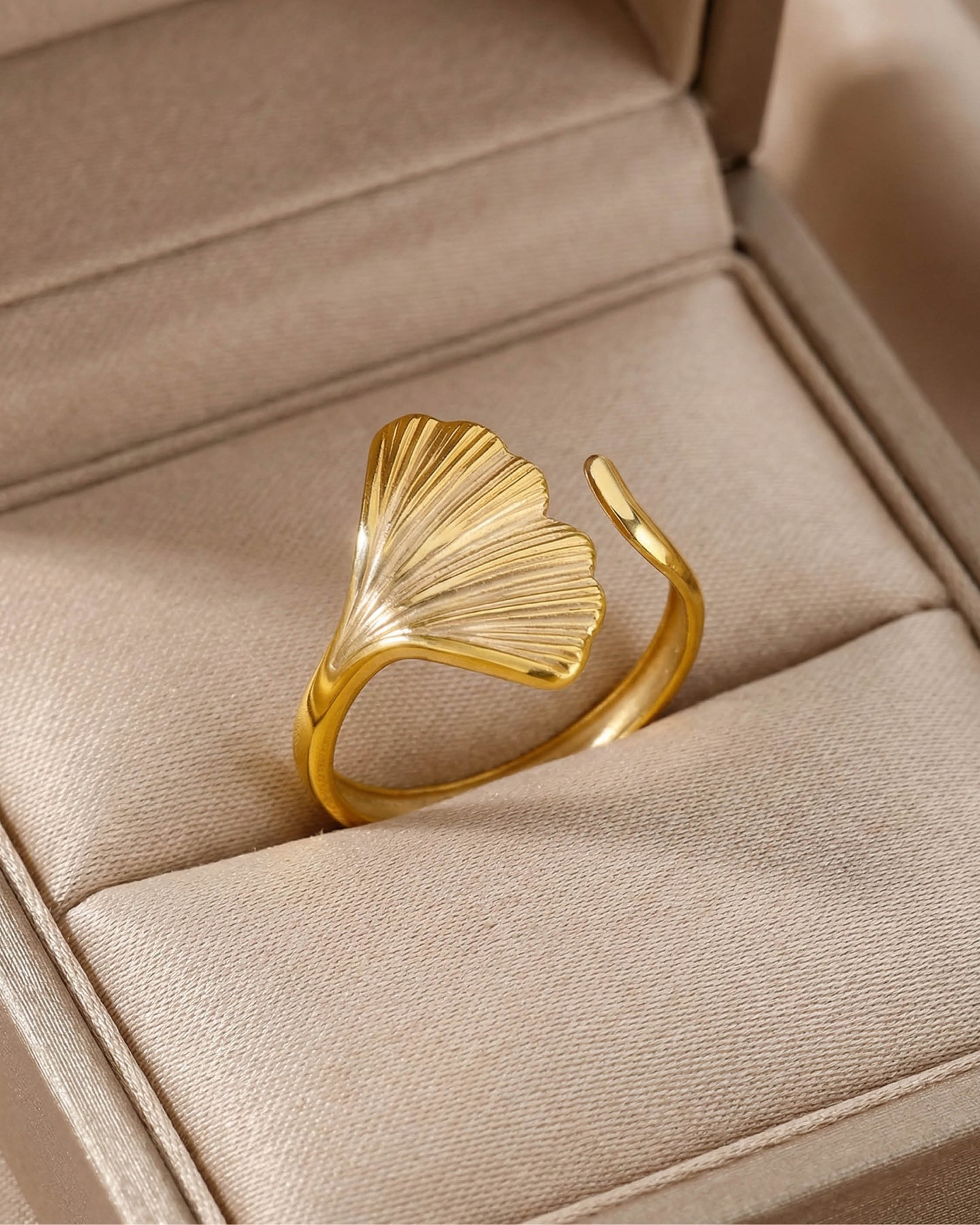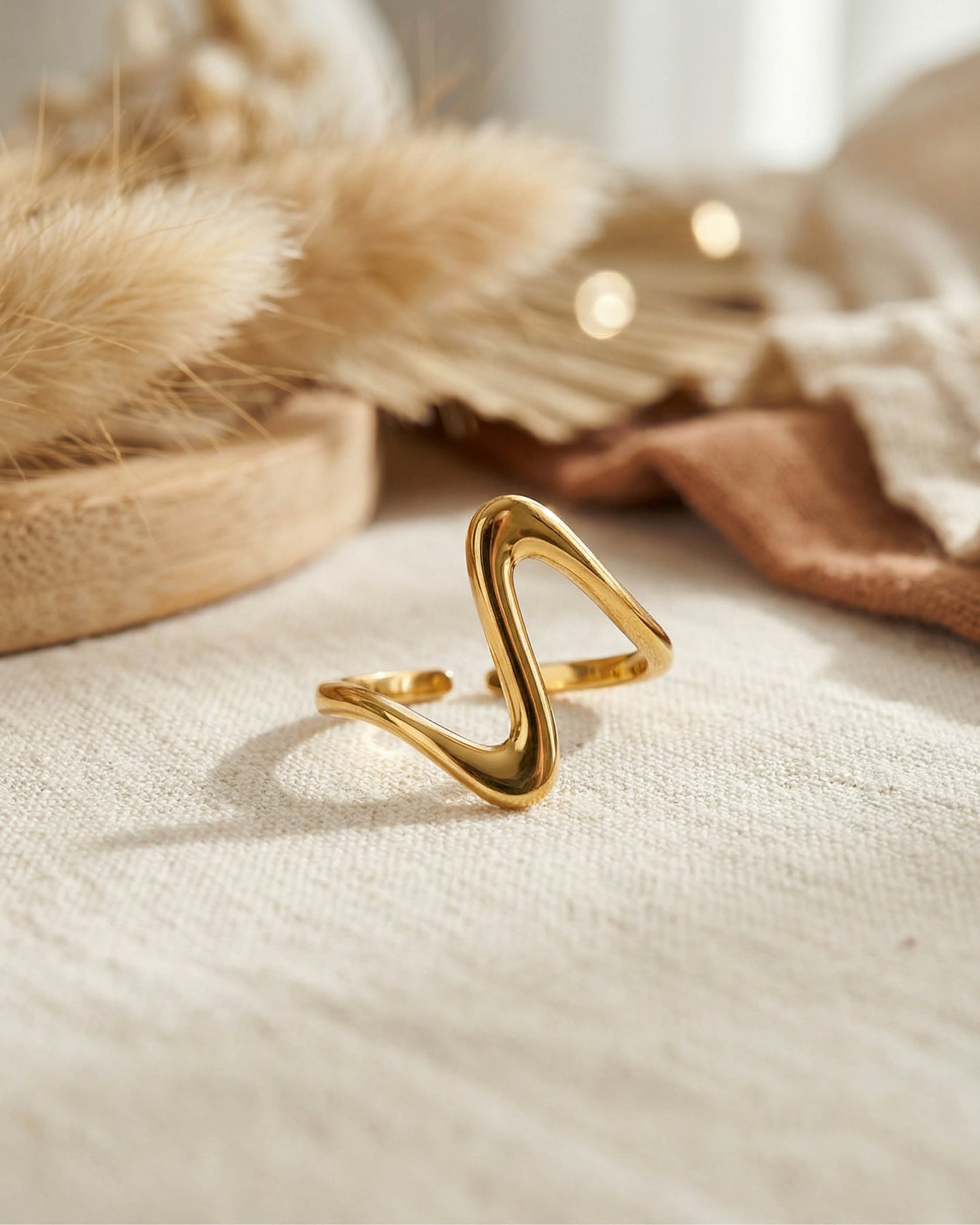 Açık uçlu minimal yapısı sayesinde parmakta hafif ve konforlu bir his bırakırken, altın kaplama yüzeyiyle gün ışığını yumuşak bir parıltıyla yansıtır.