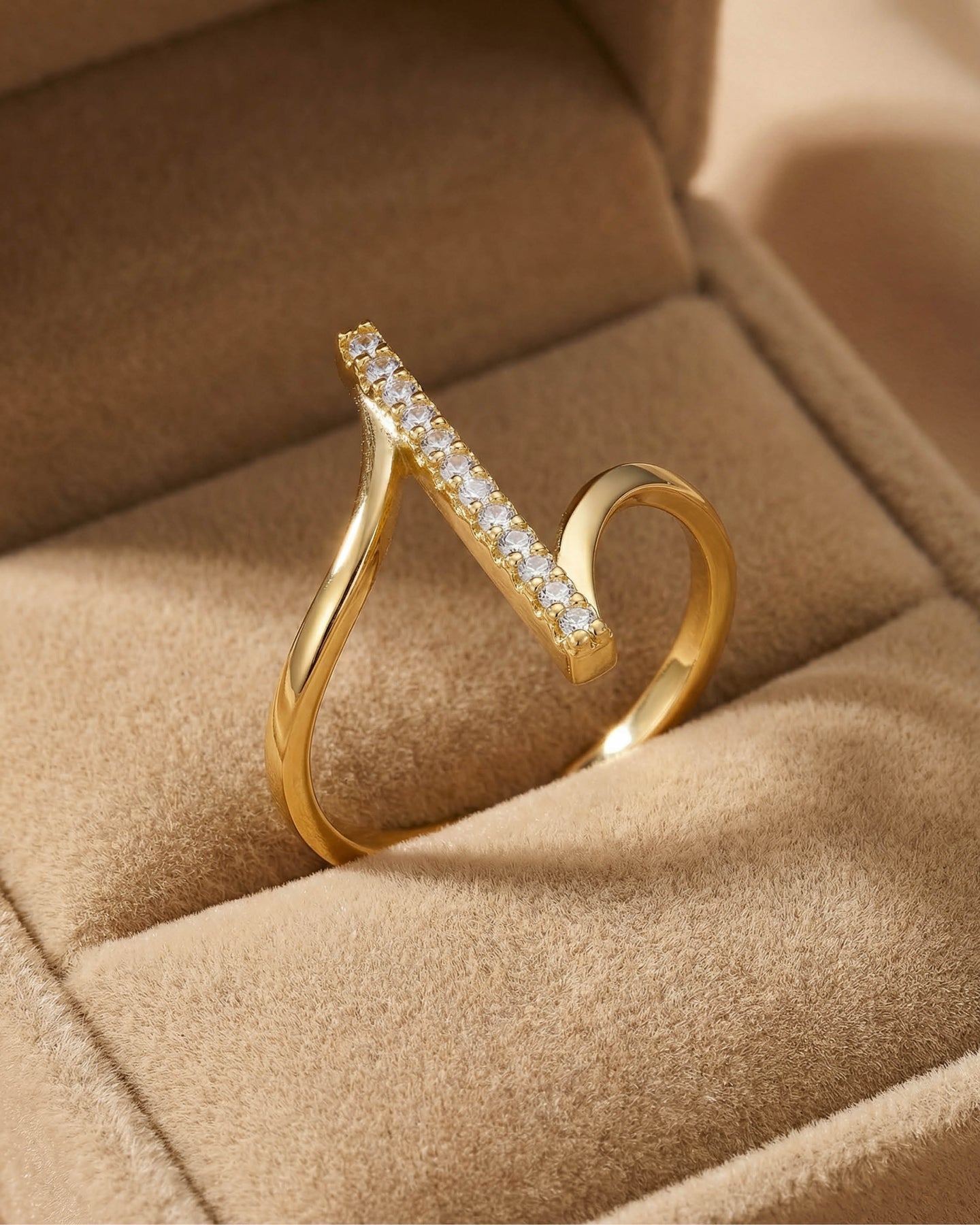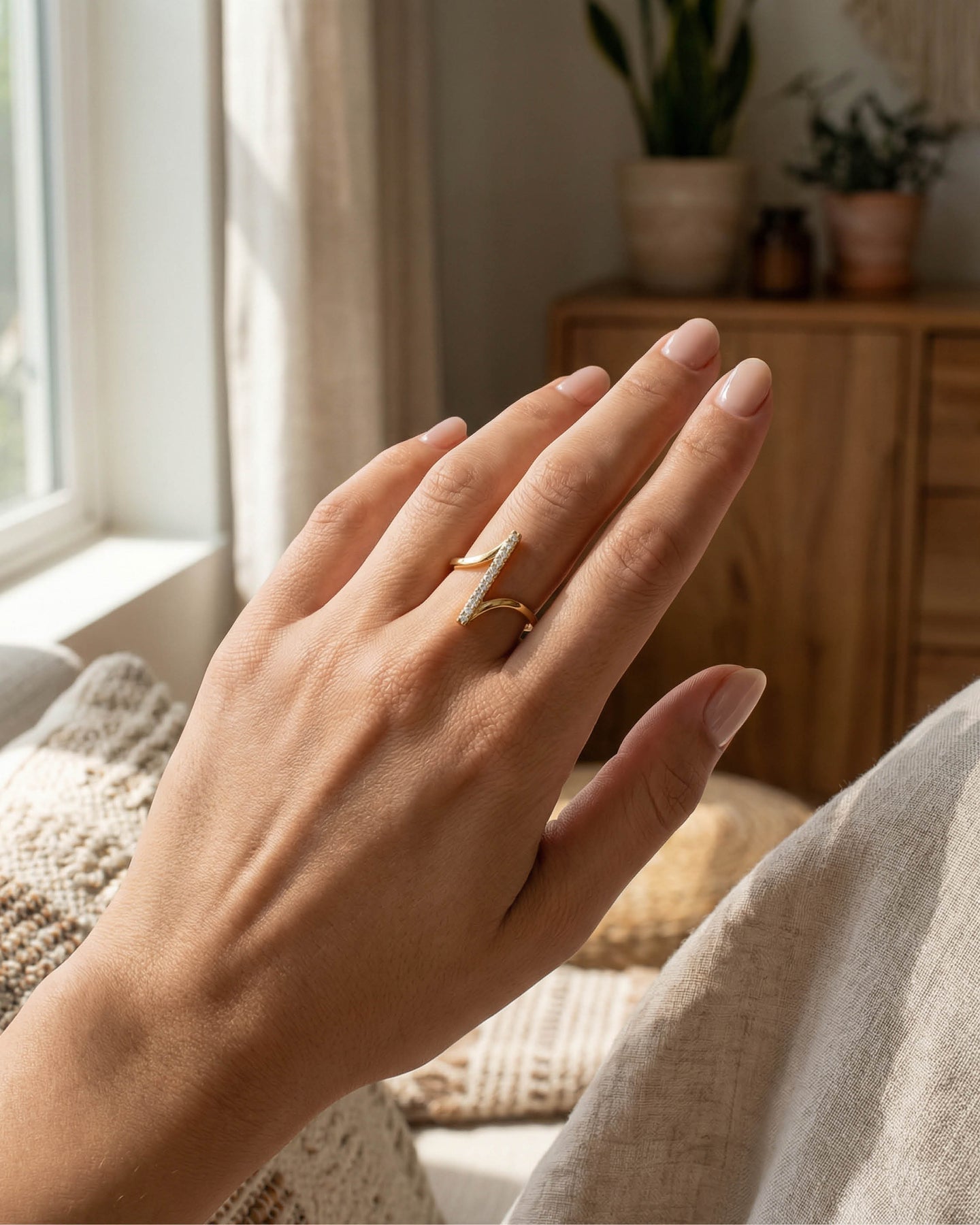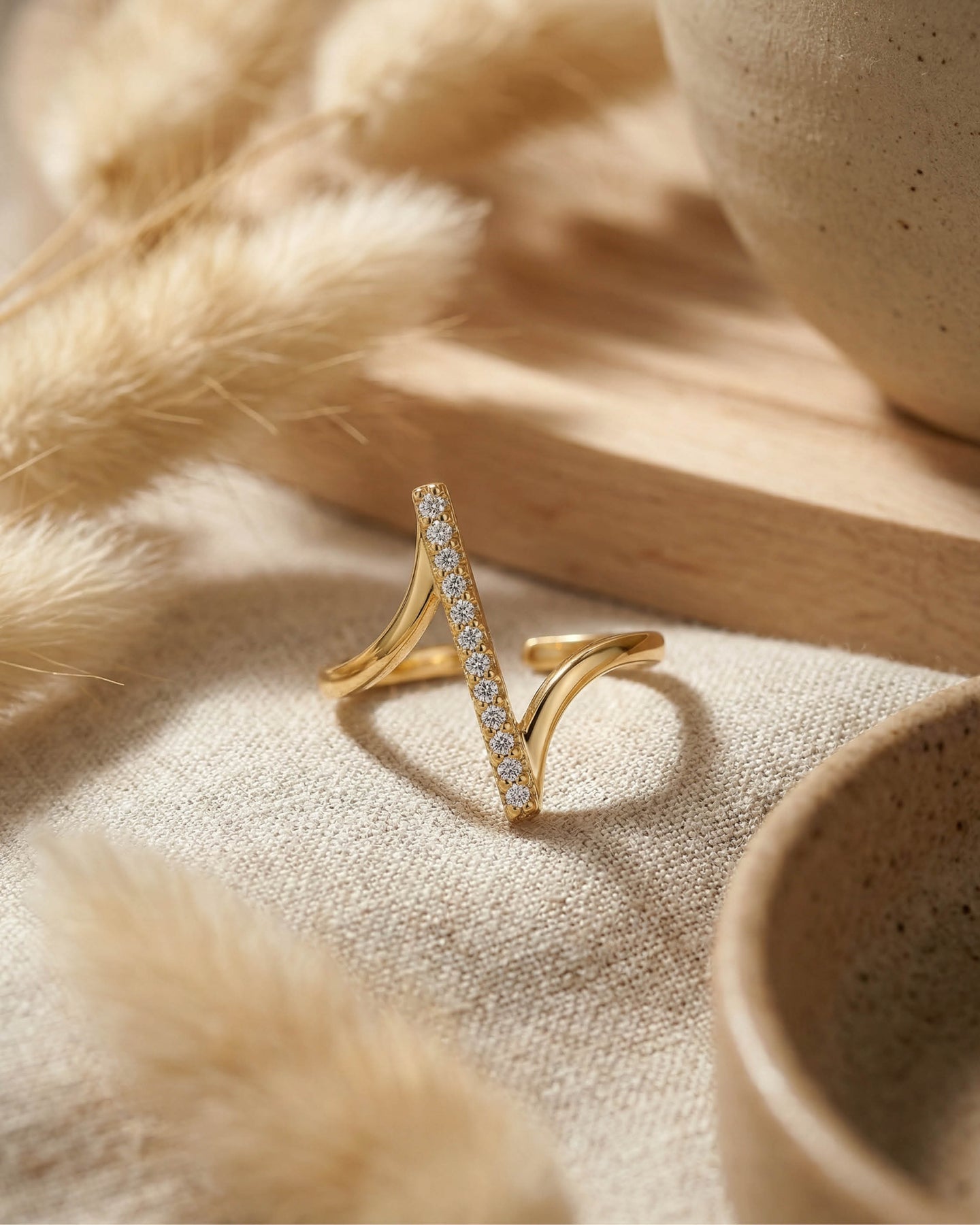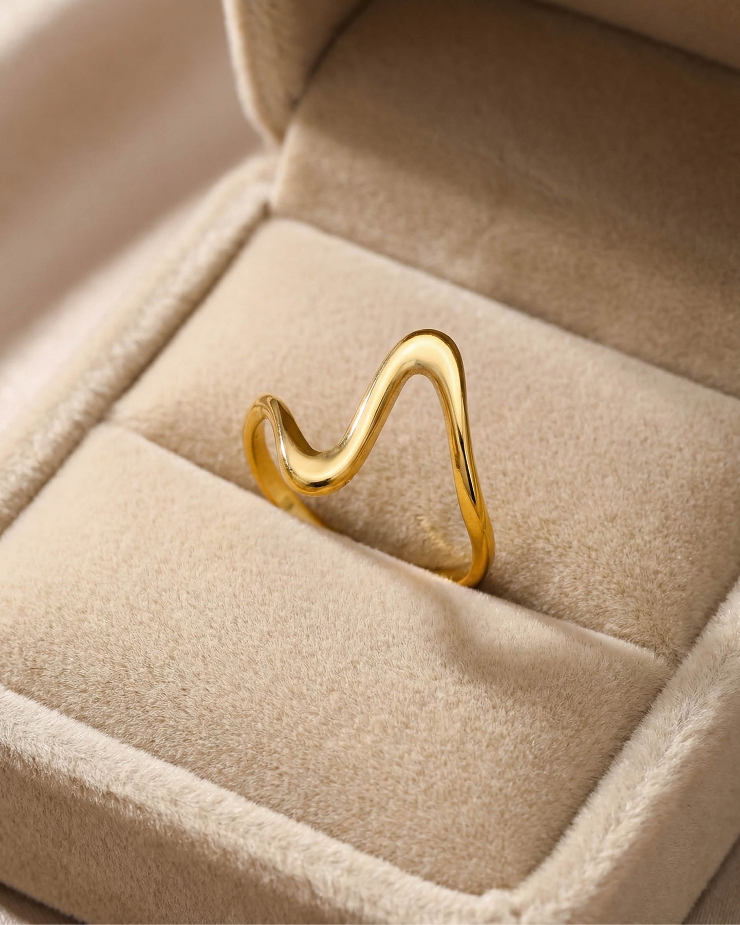 Açık uçlu minimal yapısı sayesinde parmakta hafif ve konforlu bir his bırakırken, altın kaplama yüzeyiyle gün ışığını yumuşak bir parıltıyla yansıtır.