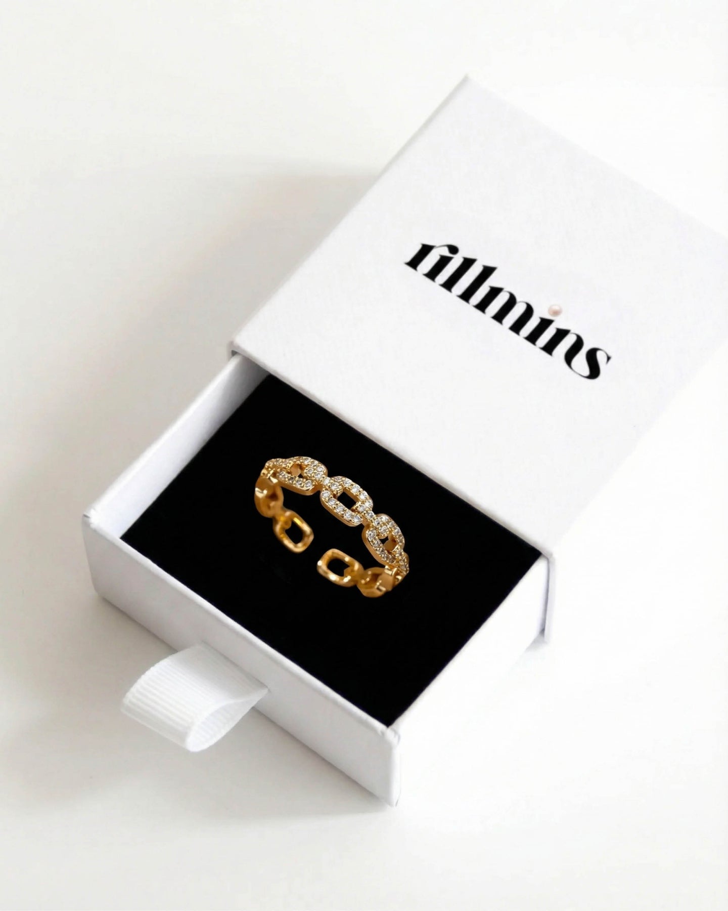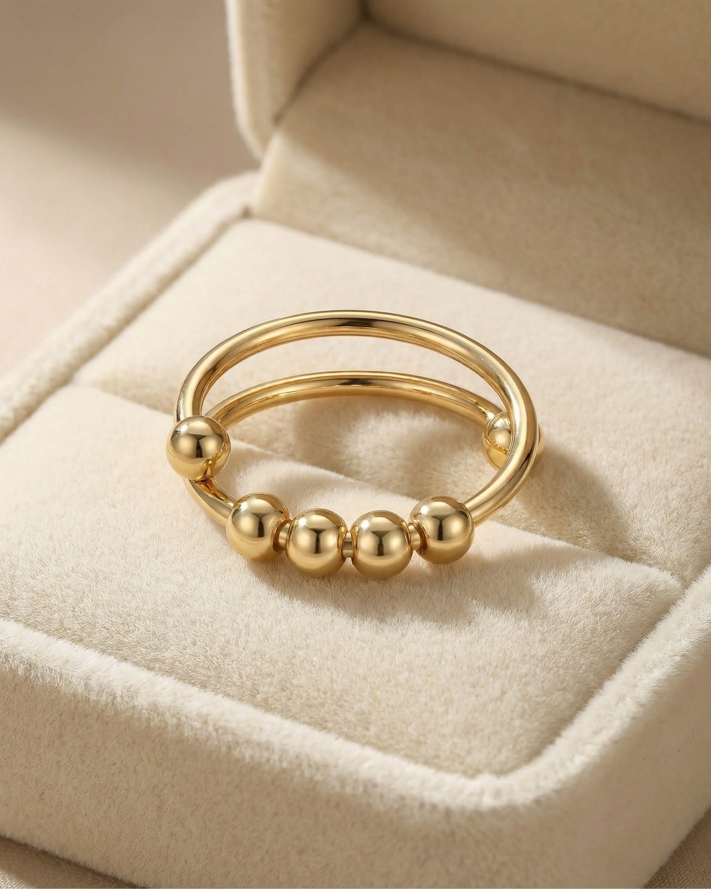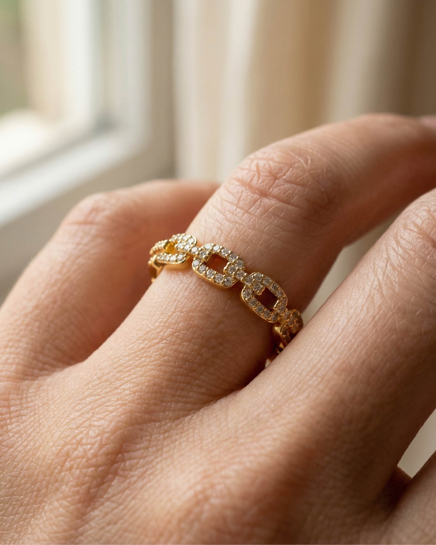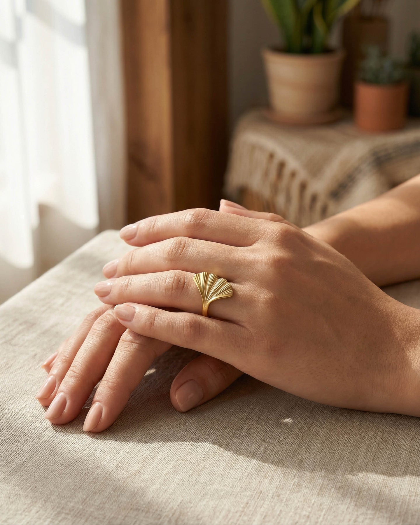 Açık uçlu minimal yapısı sayesinde parmakta hafif ve konforlu bir his bırakırken, altın kaplama yüzeyiyle gün ışığını yumuşak bir parıltıyla yansıtır.