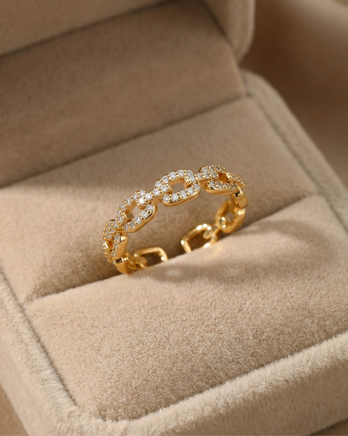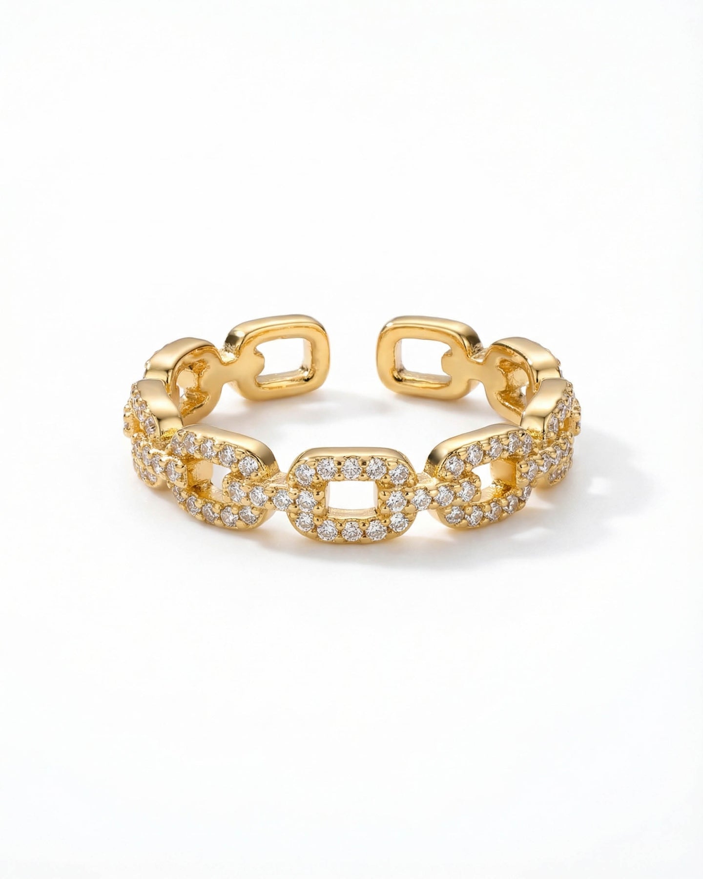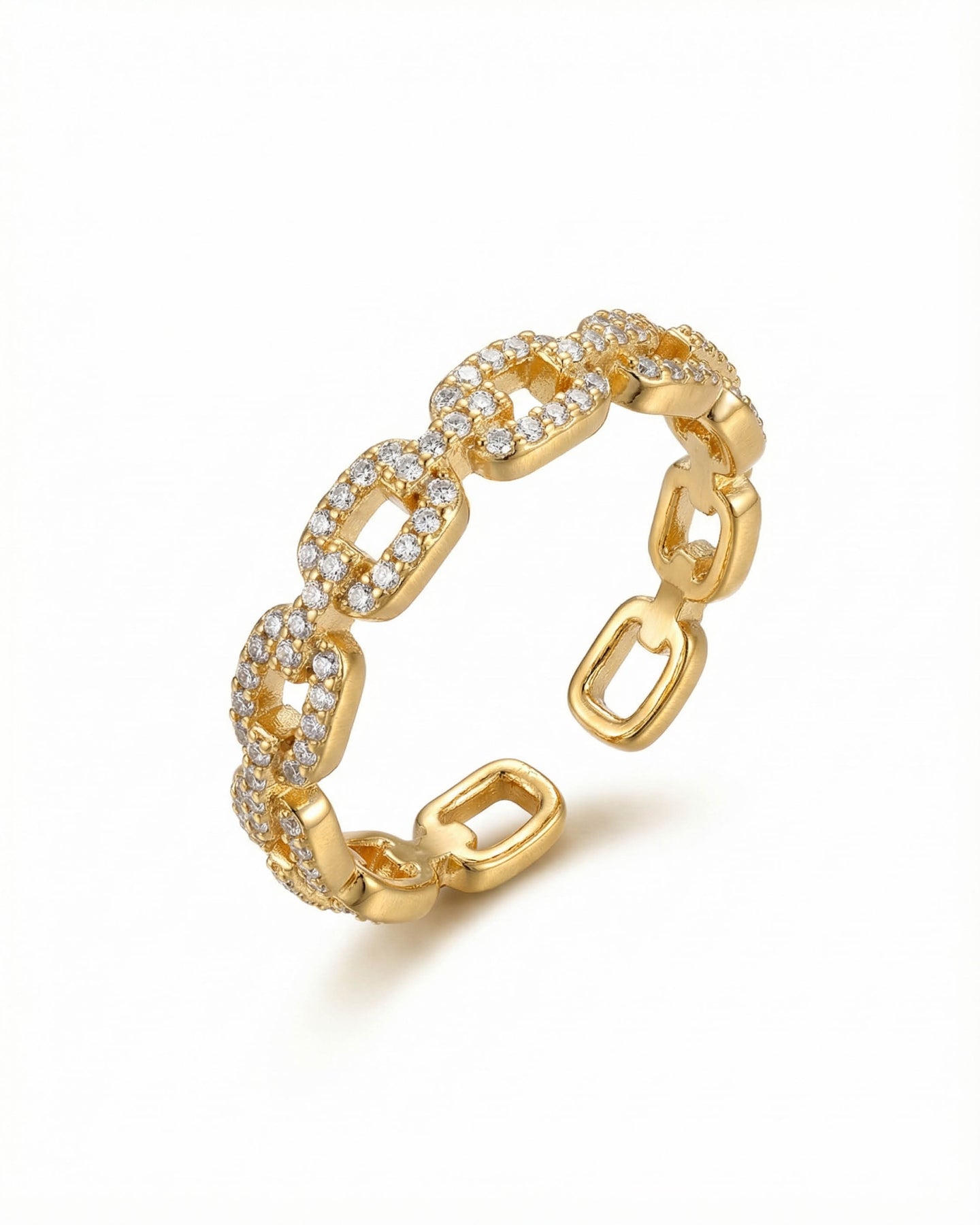 Altın kaplama gövdesi, ışıltısını uzun süre koruyan zirkon taş detayları ile tamamlanır. Işığı her açıdan yansıtan bu taşlar, yüzüğe zarif ama dikkat çekici bir parıltı kazandırır. Ayarlanabilir formu sayesinde her parmak ölçüsüne kolayca uyum sağlar ve gün boyu konforlu bir kullanım sunar.
