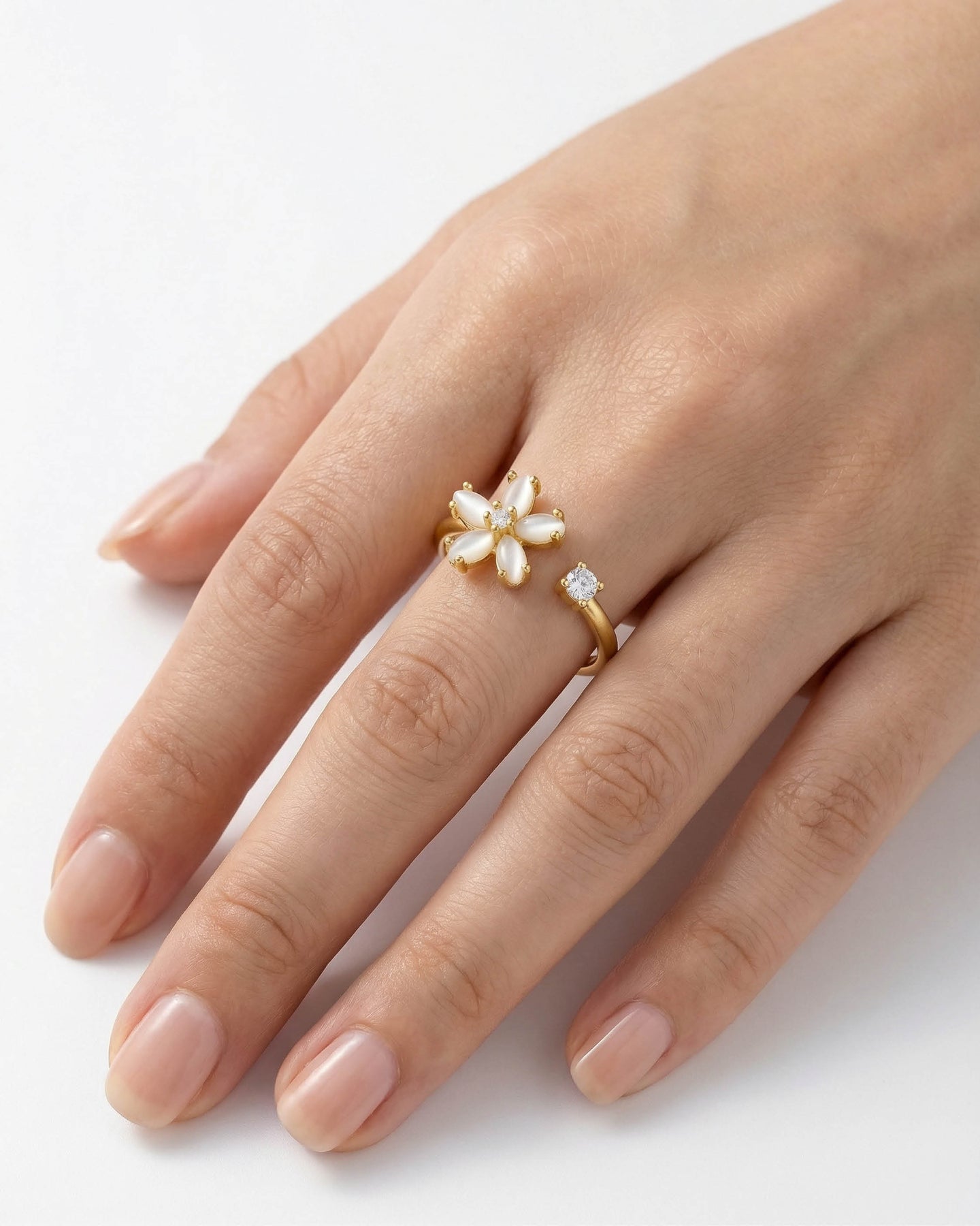 Lunéa Bloom Yüzük, sadeliğin içindeki zarafeti fısıldayan bir tasarım. İnci tonlarında çiçek formu, doğanın dinginliğini; uç kısmındaki zirkon taş ise modern ışıltıyı temsil eder.